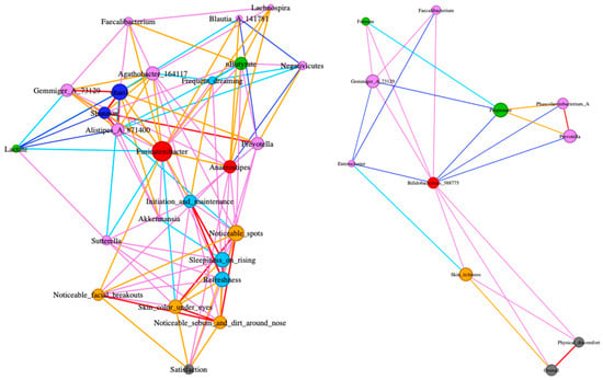 Correlation network among scores for questionnaires, concentrations of fecal organic acids, and relative abundances of major bacterial genera. Left panel: Network directly connected with genus Bifidobacterium 388775 extracted from the full network (see Figure S1). Right Panel: Network directly connected with either genus Anaerostipes or Fusicatenibacter extracted from the full network (see Figure S1). Node colors: Red: Anaerostipes, Bifidobacterium 388775, and Fusicatenibacter, Pink: Major bacterial genera except for the former three genera, Blue: Alpha diversity indices, Light green: Organic acids, Grey: JPAC-QOL, Cyan: OSA-MA, Orange: Skin condition. Scores for the stool diary were not correlated with three genera. Edge colors indicate Spearman’s correlation coefficient: Red: >0.4, Pink: 0.4–0.2, Orange: 0–0.2, Cyan: −0.2–0, Blue: −0.4–−0.2.