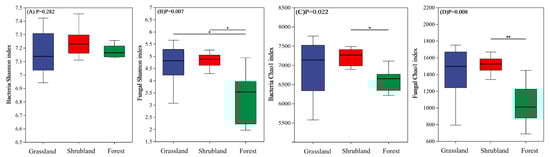 The alpha diversity metrics for bacterial and fungal communities across the different vegetation types are illustrated in Figure 1. According to the Shannon index, no significant variation in bacterial diversity was detected among grassland, shrubland, and forest soils (Figure 1A). However, fungal diversity was markedly higher in grassland and shrubland soils compared to forest soils (Figure 1B). Based on the Chao1 index, both bacterial and fungal richness were significantly elevated in shrubland soils relative to forest soils, whereas fungal richness did not differ significantly between shrubland and grassland soils (Figure 1C,D).