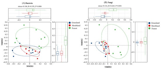 ANOSIM analysis using Bray–Curtis distances indicated significant differences in bacterial (Figure 2A) and fungal (Figure 2B) community structures among the three vegetation types (p < 0.01). Compared to grassland and shrubland soils, the microbial communities in forest soils exhibited greater variability. In contrast, microbial communities in grassland and shrubland soils were more tightly clustered, reflecting greater internal similarity and indicating more stable community structures.