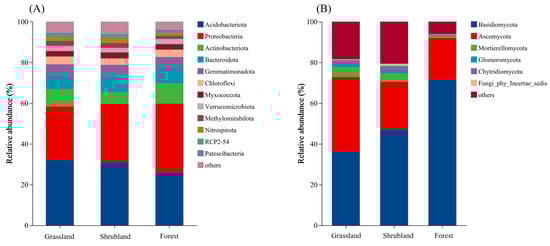 Composition of soil bacterial (A) and fungal (B) communities in different vegetation types based on phylum relative abundance.