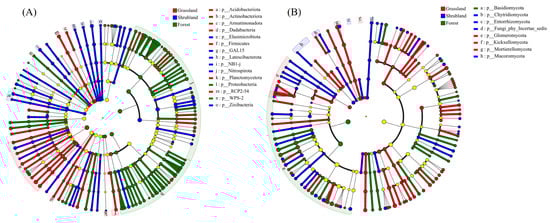 LEfSe analysis identified significant differences in the relative abundances of microbial taxa among vegetation types. A total of 15 bacterial phyla (Figure 4A) and eight fungal phyla (Figure 4B) exhibited significant enrichment patterns (p < 0.05). In grassland soils, bacterial phyla such as Acidobacteriota, Armatimonadota, Dadabacteria, Firmicutes, Planctomycetota, and RCP2-54 were significantly enriched, along with the fungal phyla Glomeromycota, Kickxellomycota, and Mortierellomycota. In shrubland soils, Elusimicrobiota, GAL15, Latescibacterota, NB1-j, Nitrospirota, and Zixibacteria dominated the bacterial community, while Chytridiomycota, Entorrhizomycota, and an unclassified fungal group (incertae sedis) were predominant among fungi. Forest soils were characterised by enriched bacterial phyla such as Actinobacteriota, Proteobacteria, and WPS-2, and a fungal community dominated by Basidiomycota.