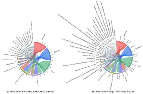Based on taxonomic annotations of 16S and ITS sequences and functional predictions using the FAPROTAX and FUNGuild databases, a total of 61 bacterial and 97 fungal functional groups were identified across the grassland, shrubland, and forest ecosystems. The 20 most abundant functional groups for each vegetation type were selected and visualised through chord diagrams to display the functional profiles of the bacterial (Figure 5A) and fungal (Figure 5B) communities. Overall, bacterial functional composition exhibited only minor variation among vegetation types, with the majority of functions related to carbon cycling. Additionally, several functional groups were linked to animal-associated pathogenicity, such as animal parasites, human pathogens, and pneumonia-associated microbes, along with nitrogen cycling processes like nitrate reduction and nitrogen fixation. Forest soils exhibited the highest proportions of genes associated with both carbon cycling (66.38%)—including chemoheterotrophy, aerobic chemoheterotrophy, and photoheterotrophy—and nitrogen cycling (9.73%), encompassing nitrate reduction, nitrogen fixation, denitrification, nitrite respiration, nitrate denitrification, and nitrite denitrification. These percentages exceeded those observed in grassland (65.02% and 7.63%, respectively) and shrubland soils (59.62% and 6.21%, respectively). In contrast, shrubland soils showed the highest relative abundance (26%) of functional groups associated with animal parasitism and pathogenicity, including animal parasites, human pathogens, pneumonia-related pathogens, and predator or exoparasitic groups, markedly higher than corresponding proportions in grassland (19%) and forest (14%) soils.