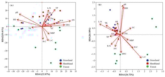 To enhance the robustness of the correlation analysis between environmental factors and microbial community structures, a variance inflation factor (VIF) analysis was performed on 21 environmental variables (Supplementary Table S1) to eliminate multicollinearity. Variables with VIF values exceeding 20—including soil sand content, SOC, MBC, and MBN—were excluded before conducting RDA. As presented in Figure 6, the RDA results accounted for 42.28% and 33.22% of the variation in bacterial and fungal phyla, respectively, influenced by the environmental variables across the different vegetation types. Overall, soil pH, BD, AN, TP, and L-C were identified as the primary environmental factors shaping bacterial community structure and diversity (p < 0.05). In grassland soils, the composition of bacterial communities is primarily determined by soil bulk density (BD) and total phosphorus (TP). In shrubland soils, soil pH serves as the predominant driver, whereas in forest soils, litter carbon (L-C) plays the key role. For fungal communities, significant predictors (p < 0.05) include soil pH, BD, L-C, litter nitrogen (L-N), and soil water content (SWC). Specifically, fungal communities in grassland and shrubland soils show the strongest associations with soil pH and L-N, while those in forest soils are more closely linked to SWC.