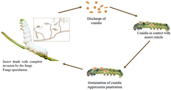 B. bassiana infects various arthropods, causing white muscardine disease [30], characterised by fungal overgrowth emerging from host cadavers. Infection occurs when spores penetrate an insect’s cuticle, proliferate internally, and lead to host death within days [31]. Fungal growth then emerges externally to release more spores [32] (Figure 1). This fungus is widely used as a biological insecticide against pests such as aphids, beetles, thrips, termites, and whiteflies, and is under study for control of bed bugs and malaria-transmitting mosquitoes [33].