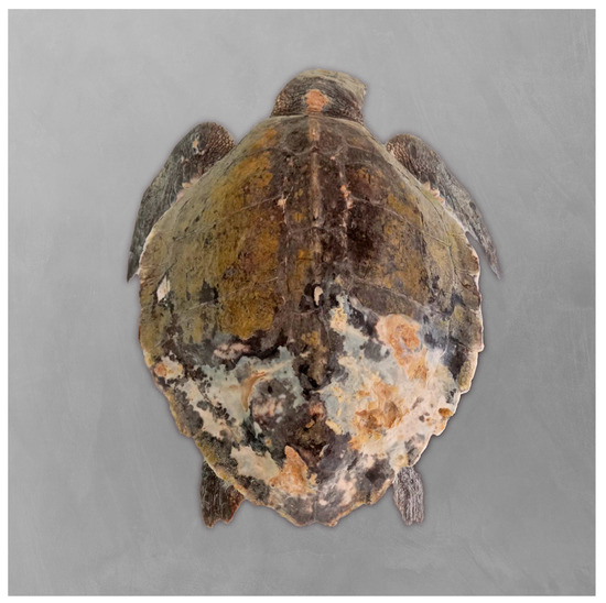 A juvenile Kemp’s ridley sea turtle (Lepidochelys kempii) rescued off the Portuguese coast was admitted to Porto d’Abrigo (Zoomarine). Upon admission, the animal weighed 2.023 kg, with a straight carapace length (SCL) of 24.4 cm and a calculated body condition index (BCI) of 1.30, using Fulton’s condition factor ([weight (kg)/SCL3 (cm)] × 104) as described by Bjorndal et al. (2000) [41]. The turtle appeared lethargic and displayed multiple lesions on the head and carapace (Figure 2), with a substantial load of epibionts.