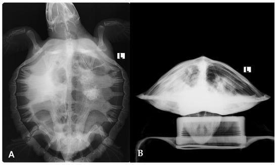 Radiographic evaluation of the Kemp’s ridley sea turtle (Lepidochelys kempii) shows increased pulmonary opacity, most pronounced in the right lung, along with ill-defined focal opacities in the left lung field. (A) Dorsoventral view; (B) craniocaudal view.