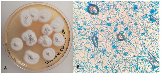 Lung tissue samples were directly inoculated onto Sabouraud Dextrose Chloramphenicol Agar (Frilabo, Maia, Portugal), incubated at both 25 °C and 37 °C, and observed daily for the development of fungal colonies. Phenotypic identification of fungal isolates was based on both macroscopic and microscopic characteristics. Macroscopic evaluation included assessment of colony growth rate, topography, texture, surface and reverse pigmentation, and the presence and colour of any diffusible pigment. Microscopic identification was performed by examining hyphal features—colour, size, septation, and structure—and conidial characteristics, including septation, shape, size, colour, wall texture, arrangement, and the morphology and development of conidiogenous cells, using Lactophenol Cotton Blue stain (Labkem, Barcelona, Spain) [19,20].
