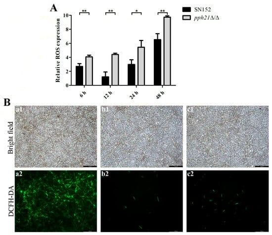 The ROS levels of SN152 and pph21Δ/Δ. (A) The relative ROS expression at different time phases (6 h, 12 h, 24 h, and 48 h), * p < 0.05; ** p < 0.01. (B) Representative DCFH-DA fluorescence images of 24 h biofilm: (a1,a2) SN152 Rosup; (b1,b2) SN152; (c1,c2) pph21Δ/Δ; 1: bright field; 2: DCFH-DA. Scale bar = 100 µm. The ROS level in pph21Δ/Δ biofilm was significantly higher than that in the control (SN152), accompanied by the increased green fluorescence intensity observed.