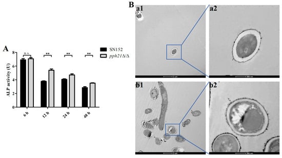 The autophagic activities of SN152 and pph21Δ/Δ biofilms. (A) ALP activity levels at different time phases (6 h, 12 h, 24 h, and 48 h). The pph21Δ/Δ biofilm exhibited significantly higher ALP activity compared to SN152 at 12, 24, and 48 h (p < 0.01); ** p < 0.01; n.s.: no significant difference. (B) Typical TEM images of autophagosomes in 24 h biofilm: (a1,a2) SN152; (b1,b2) pph21Δ/Δ; 1: scale bar = 2 µm; 2: scale bar = 500 nm.