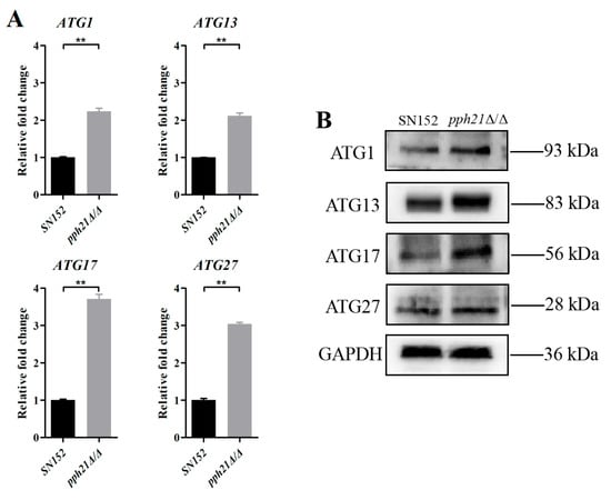 The expression levels of ATG genes and proteins of SN152 and pph21Δ/Δ biofilm. (A) Comparison of ATG gene expression levels between SN152 and pph21Δ/Δ via RT-qPCR; ** p < 0.01. (B) Comparison of ATG protein levels between SN152 and pph21Δ/Δ via Western blotting. The expression levels of ATG1, ATG13, ATG17, and ATG27 in pph21Δ/Δ biofilm were significantly upregulated (p < 0.01), and the protein levels also increased.