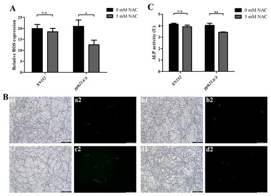 The ROS level and autophagic activity of SN152 and pph21Δ/Δ biofilms after pretreatment with NAC. (A) The relative ROS expression of the 24 h biofilm; * p < 0.05; n.s.: no significant difference. (B) Representative DCFH-DA fluorescence images of the 24 h biofilm: (a1,a2) SN152; (b1,b2) SN152 + NAC; (c1,c2) pph21Δ/Δ; (d1,d2) pph21Δ/Δ + NAC; 1: bright field; 2: DCFH-DA. Scale bar = 100 µm. (C) The ALP activity of the 24 h biofilm. The ROS level and ALP activity levels of the pph21Δ/Δ + NAC biofilm were lower than those of the untreated group (pph21Δ/Δ); ** p < 0.01; n.s.: no significant difference.