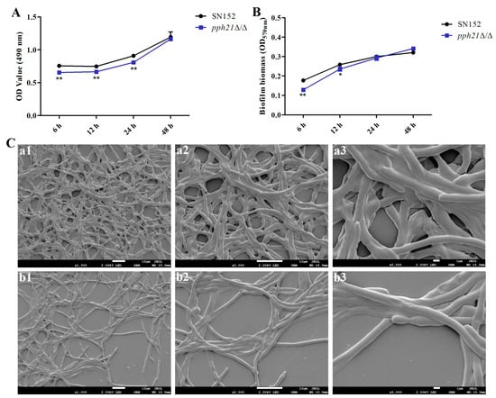The biofilm formation ability of SN152 and pph21Δ/Δ biofilms. Comparison of biofilm formation between SN152 and pph21Δ/Δ biofilms by XTT reduction assay (A) and crystal violet (CV) staining (B); * p < 0.05, ** p < 0.01: compared with SN152. (C) The morphological changes of SN152 and pph21Δ/Δ biofilms detected with SEM, whereby the density of hyphae in the pph21Δ/Δ biofilm was lower than that of the control (SN152); (a1–a3): SN152; (b1–b3): pph21Δ/Δ; magnification: 1: 1000×; 2: 2000×; 3: 5000×.