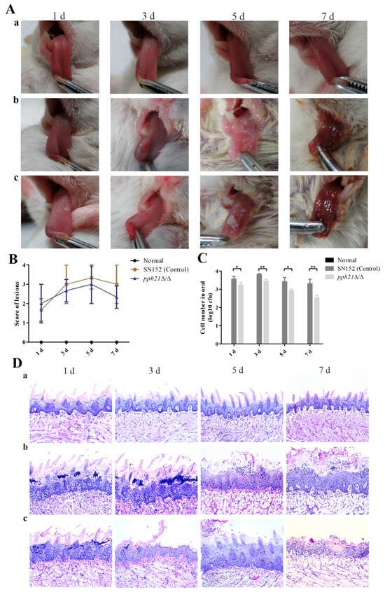 The pathogenicity of SN152 and pph21Δ/Δ to murine models. The pph21Δ/Δ mutant strain showed reduced virulence in a murine model of oral candidiasis. (A) Macroscopic observation of white patches of the lesions on murine tongues after C. albicans oral infection; (a) normal; (b) SN152; (c) pph21Δ/Δ. (B) Changes in the lesion score on the tongues. (C) The CFUs of C. albicans isolated from the murine oral cavity. No viable C. albicans cells (0 CFU) were detected in the uninfected group (normal) (no black bar shown in Figure 8C); * p < 0.05; ** p < 0.01. (D) Histopathological observation of a longitudinal section of a murine tongue (×200 magnification). The tissue sections were stained with PAS; (a) normal; (b) SN152; (c) pph21Δ/Δ.