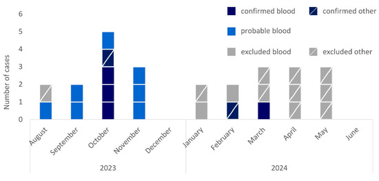Epidemic curve of cases of R. pickettii in Germany by month of sampling, case category (confirmed, dark blue; probable, light blue; excluded, grey), and material (not crossed, blood culture; crossed, other material), August 2023–June 2024 (n = 25).