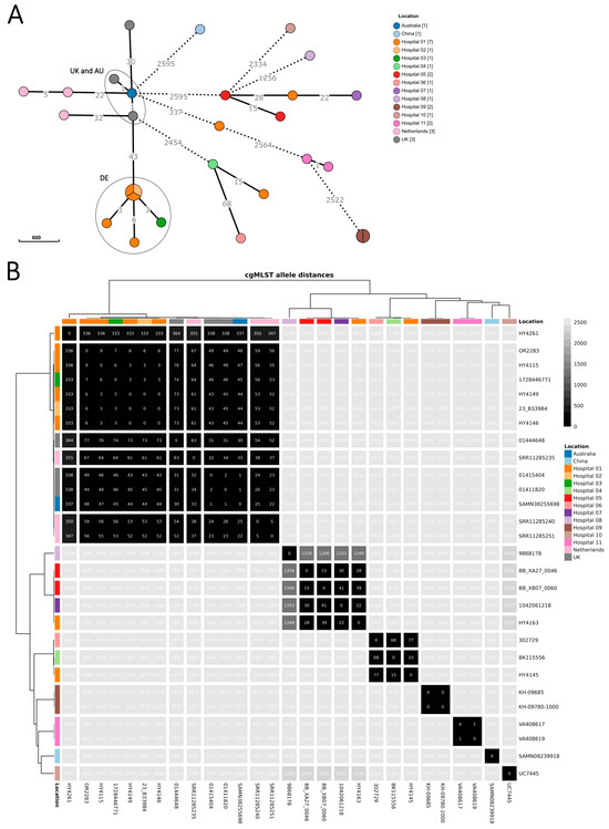 The distances between sequences in this study and those from other studies might, at least partly, be affected by low sequencing quality and batch effects (e.g., differences caused due to sequencing platform, sample preparation, assembly, coverage, etc.). In the UK investigation [31], one isolate had low sequencing yield and SNPs were discounted manually, which might explain why Saunders et al. [31] report 0–4 SNP among their isolates, compared to the 1–30 allelic differences between them in our analysis. In the previous investigation with a smaller sample set by Krone et al., the difference between the Australian and German clusters was 26 alleles [36]. This highlights how genomic cluster information is dependent on the sample set, sequencing quality, and bioinformatic analysis methods. Hence, cluster information needs to be interpreted together with epidemiological findings.