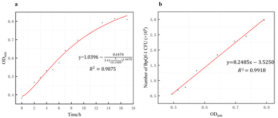 Growth curve and the concentration standard curve of strain BpQf-1. (a) The growth curve of strain BpQf-1. (b) The concentration standard curve of strain BpQf-1.