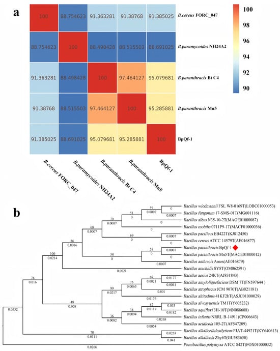 A phylogenetic tree was constructed based on the 16S rRNA of BpQf-1 for evolutionary analysis (Figure 3b). The results showed that BpQf-1 is most closely related to B. paranthracis. Meanwhile, the ANI heatmap analysis (Figure 3a) indicated that the ANI values between BpQf-1 and the two strains of B. paranthracis were both greater than 95%, suggesting a close evolutionary relationship among them.