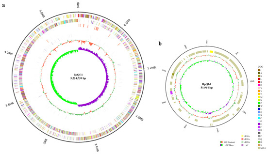 Based on the whole-genome sequencing results, genome completion maps were separately drawn for the chromosome sequence and the plasmid sequence. The genome size of strain BpQf-1 is 5.27 Mb, comprising one chromosome (5,224,739 bp) (Figure 4a) and one plasmid (51,964 bp) (Figure 4b). In the chromosome map, the outermost circle represents the size of the genome, followed from outside to inside by the COG functional annotation results, and then the distribution of ncRNAs. In the plasmid plot, the genome size, COG functional annotation, and GC distribution are shown from outside to inside.