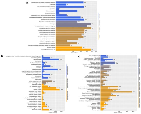 Statistical legend of gene annotation classification of BpQf-1. (a) The COG annotation of the strain BpQf-1. (b) The GO annotation of the strain BpQf-1. (c) The KEGG annotation of the strain BpQf-1.