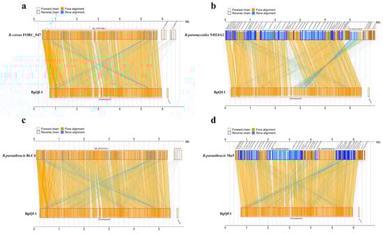 Collinearity analysis. (a) Collinearity plot of BpQf-1 and B. cereus FORC_047. (b) Collinearity plot of BpQf-1 and B. paranycoides NH24A2. (c) Collinearity plot of BpQf-1 and B. paranthracis Bt.C4. (d) Collinearity plot of BpQf-1 and B. paranthracis Mn5.