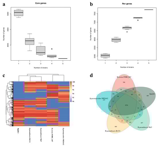 Compare the genomic differences between BpQf-1 and four other strains through core pan-genome analysis. (a) Core gene rarefaction curve, the circle represents outliers data. (b) Pan gene rarefaction curve, the circle represents outliers data. (c) Dispensable gene heat map, the left side shows the clustering tree of dispensable genes, the top shows the clustering tree of samples, the middle shows the gene similarity heat map, with different coverage levels represented by different colours, and the legend in the upper right corner shows the correspondence between colours and coverage levels. (d) Pan genome Venn diagram, the data for each region represents the number of clusters that appear in the samples in that region only. A cluster represents a group of genes with greater than 50% similarity and a sequence length difference of less than 0.3.
