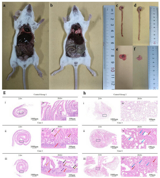 Pathological observations of pathogenicity experiments in mice. (a) Anatomy of organs in mice injected intraperitoneally with Qf-1. (b) Organ anatomy of mice injected intraperitoneally with LB medium. (c) Small intestine injected intraperitoneally with Qf-1. (d) Small intestine injected intraperitoneally with LB medium. (e) Lungs with intraperitoneal injection of Qf-1. (f) Lungs injected intraperitoneally with LB medium. (g) Small intestine HE staining results. (h) Lungs HE staining results. The control group 1, 2 was administered LB liquid medium via intraperitoneal injection, while case 1 to case 4 were the experimental groups that received intraperitoneal injection of strain Qf-1. Orange arrow: Separation of the intestinal villus epithelium from the lamina propria. Black arrow: Numerous mucosal epithelial cells have sloughed off. Brown arrow: Presence of a small amount of eosinophilic material. Red arrow: Mild interstitial vascular congestion in the lamina propria. Purple arrow: Infiltration of a small number of inflammatory cells, mainly lymphocytes. Blue arrow: Numerous granulocytes infiltrating the alveolar walls. Dark blue arrow: Edema of a small number of bronchial mucosal epithelial cells. Dark red arrow: Focal hemorrhage. Bar: (g) (i–iii) and (h) (i–iii) = 1000 µm; Bar: (g) (iv–vi) and (h) (iv–vi) = 100 µm.