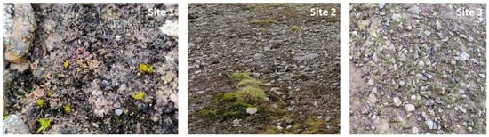 Antarctica represents one of the most extreme environments on Earth, characterized by persistent cold, strong winds, high levels of UV radiation, and seasonal desiccation [1]. Despite these extreme conditions, the continent’s ice-free areas, confined to coastal margins [2], support unique ecosystems that are crucial in understanding biological adaptations to harsh environments [1]. The organisms inhabiting these zones have adapted to extreme conditions, including low temperatures (mean temperatures ranging from −10 °C to −60 °C), high solar radiation, and limited nutrients. The terrestrial microbiota in Antarctica face challenges such as desiccation and osmotic stress, yet they have developed strategies to thrive in these conditions. The availability of liquid water is a pivotal factor in the growth and development of the terrestrial microbiota, but it is only available during the short austral summer [3]. Diverse microbial communities are found in various habitats, including soils, biocrusts, rocks, mats, and sediments. Nevertheless, the composition of these communities varies greatly between different localities, even over short distances [4,5].