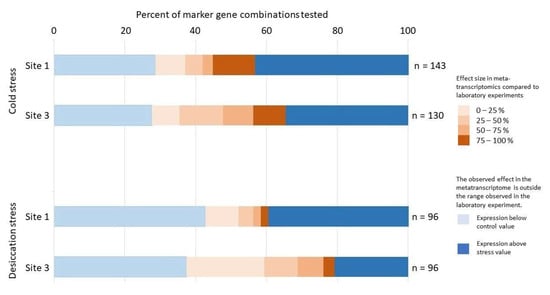 An analysis of the obtained GMI values revealed that a substantial proportion extended beyond the expected 0–100% range, indicating that the transcript expression levels may have fallen below the observed laboratory control conditions or exceeded the laboratory stress conditions (Figure 4). The GMI values were highly variable, indicating complex regulatory patterns among transcripts and reflecting diverse stress states. Furthermore, over 50% of the GMIs exhibited either a more pronounced marker gene response or values similar to those observed in laboratory stress experiments. In contrast, nearly 40% of the GMIs were lower than, or comparable to, the laboratory control levels. Excluding GMIs that fell outside the laboratory experiment range did not allow a definitive interpretation. For instance, of the 143 combinations analyzed for cold stress at site 1, only 40 produced GMIs within the expected range, with an average effect size of 53.5%. However, the high standard deviation (36.5%) indicates a wide spectrum of stress intensities, ranging from minimal to severe, comparable to those observed in the cold stress experiment. To assess the reliability of individual transcripts as stress indicators, their frequency of occurrence in GMIs within the expected range (Figure 4) was examined. However, no clear pattern was observed that would support the exclusion of specific transcripts from further analyses, indicating that individual marker genes are not reliable indicators when used in isolation. Consequently, the analysis focused on the overall expression patterns of the Klebsormidium transcripts.