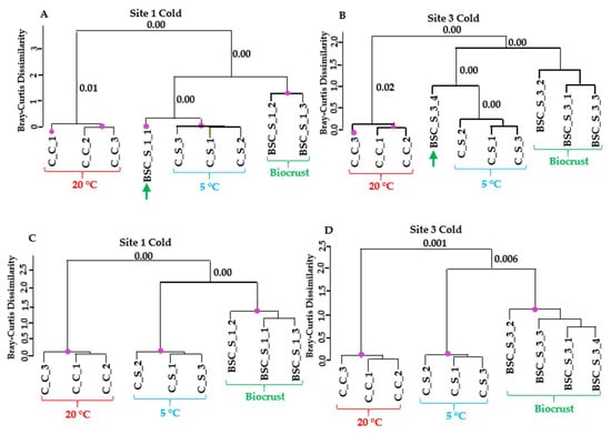 Similarity in transcript expression patterns between laboratory cold treatment of K. flaccidum and biocrust samples from sites 1 and 3. (A,B) Dendrograms based on regulated transcripts used for GMI calculation. (C,D) Dendrograms based on all regulated transcripts identified as likely derived from Klebsormidium. Purple dots indicate statistically significant clusters based on SIMPROF analysis using Bray–Curtis dissimilarity. The p-values corresponding to the merging of significant clusters are indicated near the respective branches in the dendrograms.