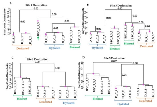 Similarity in transcript expression patterns between laboratory desiccation treatment of K. flaccidum and biocrust samples from sites 1 and 3 from Livingston Island. (A,B) Dendrograms based on regulated transcripts used for GMI calculation. (C,D) Dendrograms based on all regulated transcripts identified as likely derived from Klebsormidium. The purple dots indicate statistically significant clusters based on SIMPROF analysis using Bray–Curtis dissimilarity. The p-values corresponding to the merging of significant clusters are indicated near the respective branches in the dendrograms.