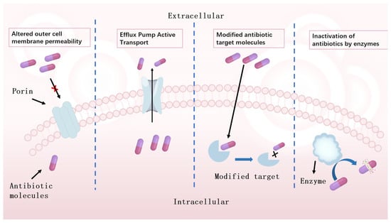 Bacteria employ four main mechanisms to counteract the effects of antibiotics [92], as shown in Figure 2. These mechanisms are summarised below: