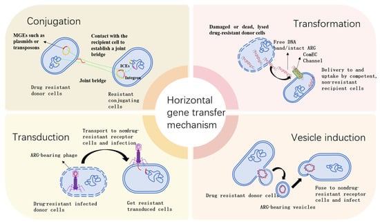 The transmission of ARGs between ARB can occur via HGT, or alternatively, these genes can be transferred from ARB to non-resistant strains within the environment. It is noteworthy that newly formed ARB have the potential to reach and infect humans in various ways [19].