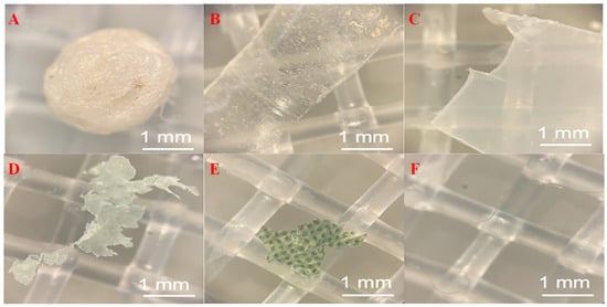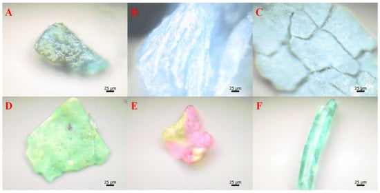 Micromorphology of microplastics in FW [41]: (A) PS fragment; (B) PET fragment; (C) PLA fragment; (D) PBAT film; (E) PE film; and (F) unidentified fiber.