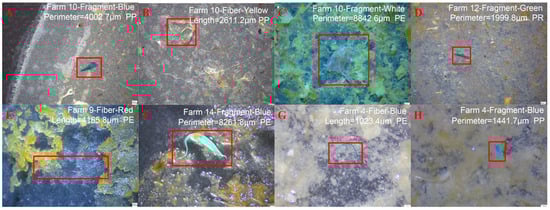 Micromorphology of microplastics in livestock manure [47]: (A–E) MPs detected in livestock manure from farmyards; (F) MPs detected in livestock manure from a layer breeding plant; (G,H) MPs detected in livestock manure from a pig plant.