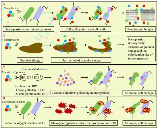Mechanisms of micro(nano)plastics affecting AD via impacting microbial cells: disrupting cell membrane and entering cell interior (A); destruction of granular sludge (B); leachate/additives poisoning microorganisms (C); and inducing ROS (reactive oxygen species) production that damages microorganism cells (D).