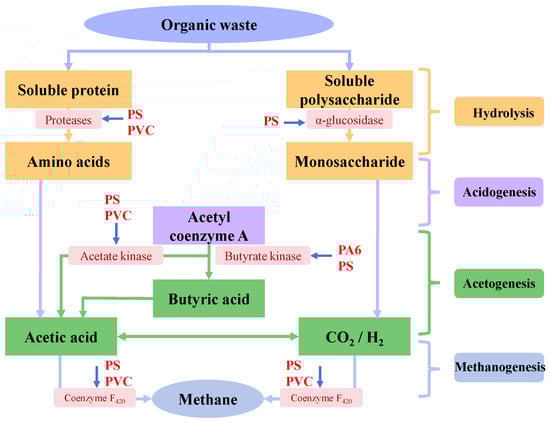 Anaerobic digestion (AD) is a sustainable waste-to-energy technology that could convert organic waste to biogas (mainly methane and carbon dioxide) by anaerobic microorganisms. Currently, AD is the predominant treatment technology of biodegradable organic wastes such as sludge, FW and livestock manure [20]. These organic wastes often contain plenty of micro(nano)plastics and they enter the AD system by the feeding of digesters together. Thus, these organic wastes are the main sources and pathways of micro(nano)plastics entering the anaerobic system [21]. Recent studies found that micro(nano)plastics often exhibit negative effects on AD performance [6]. Fu et al. investigated the impact of 54.8 nm polystyrene (PS) nanoplastics at a concentration of 0.2 g/L on hydrogen production of a pure anaerobic system of Acetobacteroides hydrogenigenes and found that PS nanoplastics decreased the hydrogen yield from 13.0 mL to 12.3 mL, and many PS nanoplastic particles attached to the cell membrane of Acetobacteroides hydrogenigenes and caused cell wall pitting [1]. Wei et al. also reported that polyvinyl chloride (PVC) microplastics with a particle size of 1 mm and concentrations of 20 to 60 particles/g total solids (TS) reduced the methane production of the AD of waste-activated sludge (WAS) to 75.8–90.6% of that of the control due to the toxic bisphenol A leached from PVC microplastics, and stronger inhibition occurred at higher concentrations [22]. Similarly, Wei et al. reported that polyethylene (PE) microplastics at concentrations of 100–200 particles/g TS reduced methane production by 12.4–27.5% of the AD of WAS [23]. This reduction might be attributed to the induction of reactive oxygen species (ROS) production by PE microplastics, which could decrease anaerobic microbial activity. In contrast, Chen et al. observed that the addition of polyamide 6 (PA6) microplastics at a dosage of 5–50 particles/g TS significantly increased the methane production of the AD of WAS from 124 ± 6 L CH4/kg volatile solids (VS) to 173 ± 8 L CH4/kg VS, representing an increase of 39.5%, and supposed that the leaching of caprolactam from PA6 enhanced the activity of key enzymes involved in acidogenesis and methanogenesis during AD [24]. Furthermore, previous studies demonstrated that micro(nano)plastics significantly enhanced abundances of antibiotic resistance genes (ARGs) in the anaerobic system, which may pose potential risks to human health and the environment [25,26,27]. Significantly, various pollutants (antibiotics, heavy metals, etc.) would be adsorbed onto micro(nano)plastics, causing negative effects on AD [5].