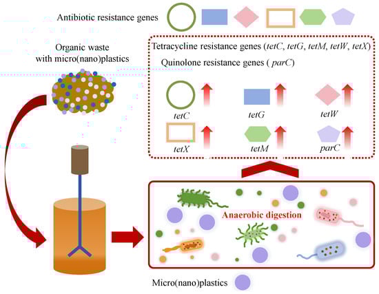 Some organic wastes (typical for sludge and livestock manure) contain significant amounts of ARGs such as tetracycline resistance genes (tetA, tetB, tetP, tetC, tetE, tetG, tetM, tetO, tetQ, tetT, tetW, tetX, etc.), macrolide resistance genes (ermB, ermC, etc.), sulfonamide resistance genes (sul1, sul2, etc.), quinolone resistance genes (qepA, oqxB, parC, etc.), beta-lactam resistance genes (blaOXA, blaTEM, etc.) and integron integrase genes (intI1, intI2, etc.) [27,70,84]. During AD, ARGs carried by organic wastes enter the AD system along with micro(nano)plastics. The presence of micro(nano)plastics influences the abundance of ARGs in AD, as shown in Figure 7. Shi et al. found that ARG abundance in the AD system of WAS with the addition of 180 μm PE microplastics reached 7.6 × 108 (sul2), 1.3 × 107 (blaOXA), 2.0 × 108 (tetW), 6.0 × 108 (tetO) and 1.0 × 107 (tetQ) copies/g sludge, and those of the digester, with the addition of 1 mm PE microplastics, were 9.6 × 108 (sul2), 2.2 × 107 (blaOXA), 2.3 × 108 (tetW), 8.8 × 108 (tetO) and 1.4 × 107 (tetQ) copies/g sludge, indicating that PE microplastics induced the enrichment of ARGs [25]. In detail, compared to the control without microplastic addition, the addition of 180 μm PE microplastics increased total ARG abundance 1.2–3.0-fold, while the addition of 1 mm PE microplastics induced a greater increase in ARG abundance (1.5–4.0-fold) [25]. Similarly, Zhang et al. reported that PE microplastics significantly increased the fold changes of tetC, tetG, and tetW in the AD of dairy wastes from 0.71 to 12.63 to 1.15–28.62 [70]. Xiao et al. found that PP microplastics induced the increase in the abundance of tetX (13.1–73.6%), tetM (1.5-fold) and parC (35.5–222.7%) in the AD system and also induced the enrichment of mobile genetic elements such as ISCR1 and intI1 [27]. Li and Yuan observed that polylactic acid (PLA) microplastics, PE microplastics and PET microplastics with an approximate particle size of 100 μm increased the abundance of ARGs in the AD of sludge by 14.15%, 29.90% and 18.64%, and meanwhile induced the enrichment of mobile genetic elements [26]. Moreover, Luo et al. reported that microplastics enhanced the prevalence of ARGs in anaerobic sludge digestion by enriching antibiotic-resistant bacteria [85]. The abundances of ARGs demonstrated a dosage-dependent relationship within the range of 10 to 80 particles/g TS of microplastics, resulting in an increase from 4.5 to 27.9% compared to the control [85]. Wang et al. found that 40–48 μm PE microplastics at concentrations of 50–200 particles/g TS promoted the proliferation of ARGs and mobile genetic elements during thermophilic AD of sewage sludge and PE microplastics; ARGs and mobile genetic elements exhibited strong positive correlations [86]. The enrichment of some functional genus occurred under PE microplastic stress, which might be the potential host of ARGs and mobile genetic elements [86]. Furthermore, PET microplastic fibers at the concentration of 170 items/g TS were reported to significantly increase the abundance of extracellular ARGs during the AD of sewage sludge, and the absolute and relative abundances of extracellular ARGs were 1.70- and 2.15-fold higher than those in the control [87]. In addition, it was reported that some plastic additives (typical for plasticizers), such as dimethyl phthalate, could promote the spread of ARGs during the AD of sludge [88]. Meanwhile, the aging of micro(nano)plastics also influences the enrichment of ARGs in the AD system. Haffiez et al. found that the relative abundance of ARGs in digesters exposed to aged PS nanoplastics was higher than those exposed to non-aged PS nanoplastics [84]. Most previous studies reported that the presence of micro(nano)plastics in the AD system would enrich ARGs and increase the spread risk and the potential health threat. Interestingly, several studies proposed that micro(nano)plastics might reduce the abundance of ARGs during AD. Xu et al. found that the exposure to PA microplastics, PE microplastics and PP microplastics resulted in a decrease in the total abundance of ARGs by 5.6–24.6%, accompanied by an increase in methane production by 11.7–35.5% in the AD of WAS [75]. The interaction mechanism between micro(nano)plastics and ARGs during the AD of organics should be further explored.