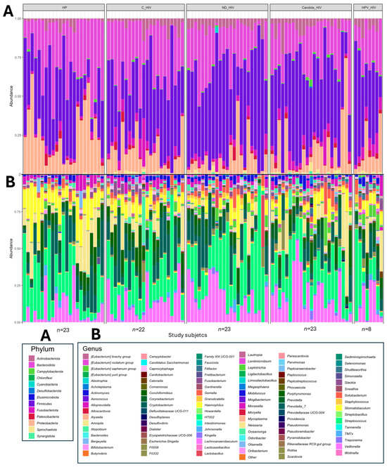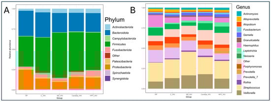 Taxonomic profile and relative abundance of the oral microbiota of the five groups of patients with different clinical conditions of HIV. (A). Phila level. (B). Genus level. HP: Controls (without HIV), C_HIV: Virally suppressed, ND_HIV: Recently diagnosed HIV, Candida_HIV: HIV and oral candidiasis, HPV_HIV: HIV and HPV-related oral lesions.