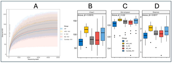 Alpha diversity was assessed in the five groups at different clinical conditions of HIV using the Chao1, Gini–Simpson and Shannon diversity indices. For this purpose, a prior analysis of amplicon sequence variant (ASV) richness per study group was performed, showing that all populations reached a plateau, indicating that the sequencing depth was adequate to capture the highest bacterial diversity present, regardless of the numerical disparity of the groups, mainly those participants with oral HPV lesions (n = 8) (Figure 3A). Interestingly, the curves corresponding to the HPV_HIV and HP groups showed higher cumulative ASV richness, even though the group of participants with oral HPV lesions was smaller compared to the other clinical conditions. Finally, the remaining three groups (C_HIV, ND_HIV, and Candida_HIV) showed similar behaviour in terms of richness.