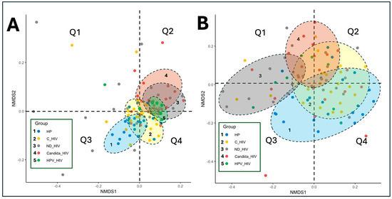 Beta diversity of the oral microbiota among the five groups of clinical conditions of HIV infection was assessed using non-metric multidimensional scaling (NMDS) analysis from UniFrac distances (weighted and unweighted). Figure 4A, corresponding to the unweighted analysis, shows a partial separation of the composition of all groups. The group of healthy subjects (HP) was mainly distributed in quadrant Q3, while the group of subjects with viral control (C_HIV) and those with oral HPV lesions (HPV_HIV) were clustered in quadrant Q4, showing a relative closeness in their composition.