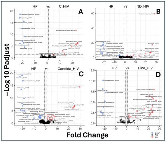 Differential species abundance between groups by biplots analysis of the oral microbiota of the five groups of patients with different clinical conditions of HIV. (A): HP vs. C_HIV (Controls vs. Virally suppressed), (B): HP vs. ND_HIV (Controls vs. Recently diagnosed HIV), (C): HP vs. Candida_HIV (Controls vs. HIV and oral candidiasis), and (D): HP vs. HPV_HIV (Controls vs. HIV and HPV-related oral lesions).