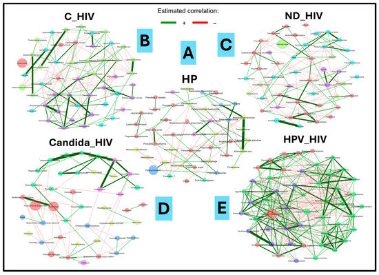 Microbial co-occurrence networks analysis of the oral microbiota of the five groups of patients with different clinical conditions of HIV. (A): HP: Controls (without HIV), (B): C_HIV: Virally suppressed, (C): ND_HIV: Recently diagnosed HIV, (D): Candida_HIV: HIV and oral candidiasis, (E): HPV_HIV: HIV and HPV-related oral lesions.
