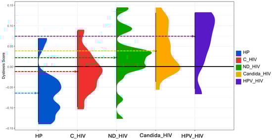 To quantify the microbial imbalance (eubiosis) between the different groups analysed, the Dysbiosis Score was used, based on Bray–Curtis dissimilarity metrics and filtering of taxa with a minimum prevalence of 5%. Figure 7 shows the distribution of the dysbiosis score for each of the five study groups, revealing a progressive gradient of bacterial dysbiosis from healthy controls (HP) to patients with HIV and oral Candida and HPV lesions. As can be seen, the healthy control group (HP) shows a score that is interpreted as an oral microbiota considered eubiotic, with dysbiosis values centred around zero (−0.06), which establishes an adequate baseline profile.