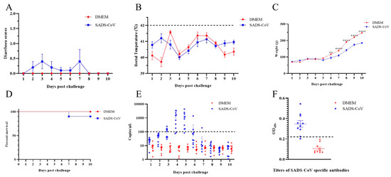 Overall clinical symptoms of ducklings infected with SADS-CoV. The 10 day-old ducklings were randomly divided into two groups (n = 10), and one group (SADS-CoV) were orally infected with 5.95 log10 TCID50 SADS-CoV/HNNY/2023 strains per duckling. The other group (DMEM) was orally inoculated with the same volume of DMEM in the same manner as the control. (A) Daily clinical symptoms were scored using the following criteria: 0 = normal, 1 = soft (cowpie), 2 = liquid with some solid content, 3 = watery with no solid content, and 4 = death. The rectal temperature (B) and weight of the ducklings (C) were measured daily. The dashed line represents the reference value for fever in ducklings (42 °C). The data were analyzed by two-way ANOVA using GraphPad Prism software 8.0.2 (** p-value < 0.01, and **** p-value < 0.0001) with a 95% confidence interval. (D) The survival curve after viral challenge was determined. (E) The viral loads of daily anal swabs were determined by quantitative PCR. The dash line represents the detection limit of qPCR. (F) Detection of SADS-CoV-specific antibody titers in serum. The dashed line represents the positive cutoff value (2.1 times the average value of the negative serum).