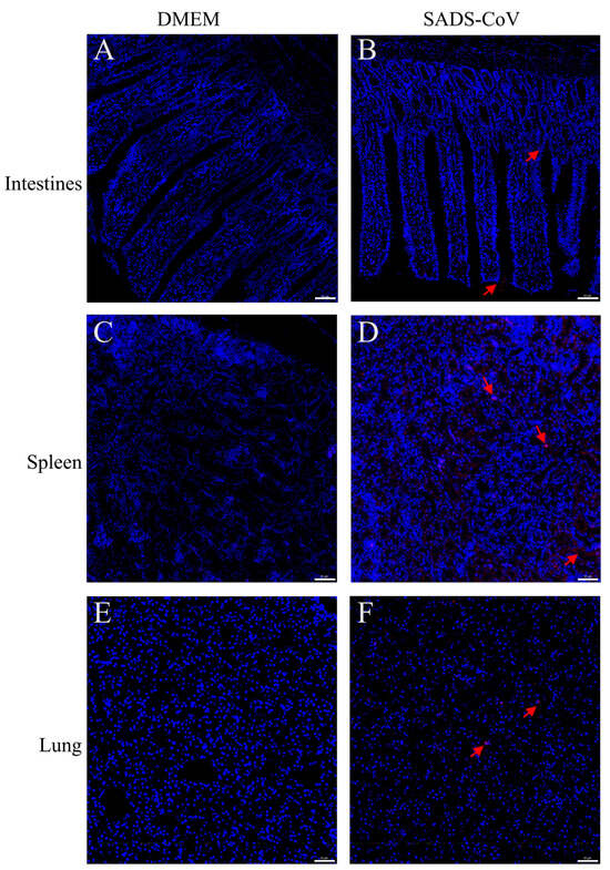 Immunofluorescence histochemistry examination of representative organs from challenged ducklings and control. Intestines (Jejunum) tissues (A,B), spleen tissues (C,D), and lungs ((E,F), at the bottom) were harvested at 10 dpc. Tissues were sectioned to 3–4 μm slices and immunofluorescence examination was performed using an mAb specific for SADS-CoV-N protein. Scale bar: 50 μm. The red arrows indicated the a portion of the SADS-CoV antigen. DMEM: Dulbecco’s Modified Eagle’s Medium, SADS-CoV: swine acute diarrhea syndrome coronavirus.