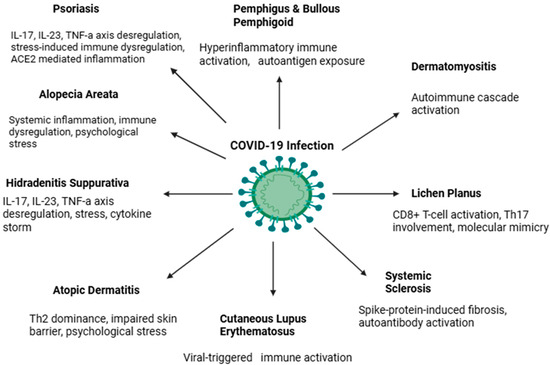 From the start of the outbreak, several reports appeared on the autoimmune manifestations and autoimmune sequelae of Coronavirus Disease-2019 (COVID-19) infection [1]. The COVID-19 pandemic has brought unprecedented challenges to healthcare systems globally, not only due to the acute effects of SARS-CoV-2 infection, but also because of its broader immunological consequences. Increasing evidence suggests that COVID-19 can act as a trigger or modulator of autoimmune phenomena. Autoimmune skin diseases (ASDs), including psoriasis, hidradenitis suppurativa (HS), atopic dermatitis (AD), and alopecia areata, have shown variable responses during the pandemic, ranging from disease exacerbation to new-onset presentations. Potential mechanisms include direct viral effects, molecular mimicry, dysregulated cytokine responses, and psychological stress. Moreover, the widespread use of immunomodulatory therapies and the introduction of COVID-19 vaccines have raised questions about the safety, efficacy, and impact of these interventions in patients with preexisting or newly emerging ASDs [2]. Despite the growing body of literature, the relationship between COVID-19 and ASDs remains incompletely understood. Current reports are fragmented, and the findings are sometimes conflicting, particularly regarding the bidirectional effects of infection and treatment. A comprehensive synthesis is therefore needed to clarify the clinical patterns, pathophysiological mechanisms, and therapeutic implications. This review aims to summarize the available evidence on the interplay between COVID-19 and autoimmune skin diseases, highlight emerging pathophysiologic insights, and discuss implications for clinical management and vaccination strategies.