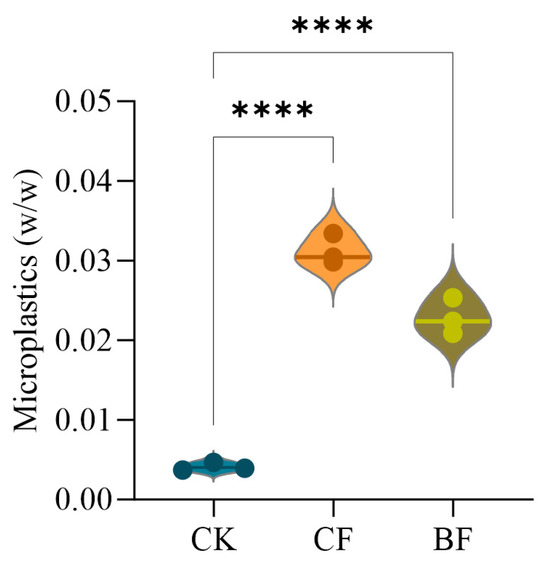 Microplastic concentration in soil. Values are represented as the mean ± standard error (n = 3). CK (no mulch film application), CF (addition of PE film fragments); BF (addition of PLA + PBAT film fragments). **** p < 0.0001.