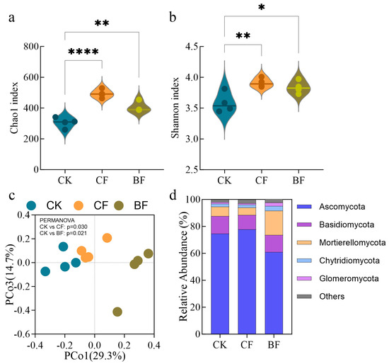 Rhizosphere soil fungal community analysis. (a) Chao1 index, (b) Shannon index at the ASV level, (c) Principal Coordinates Analysis (PCoA) and (d) relative abundance at the phylum level. Values are represented as the mean ± standard error (n = 4). CK (no mulch film application), CF (addition of PE film fragments); BF (addition of PLA + PBAT film fragments). * p < 0.05, ** p < 0.01 and **** p < 0.0001.