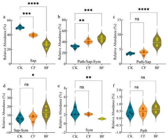 Relative abundance of major fungal functional guilds in the rhizosphere soil. The guilds are abbreviated as (a) Saprotroph (Sap), (b) Pathotroph-Saprotroph-Symbiotroph (Path-Sap-Sym), (c) Pathotroph-Saprotroph (Path-Sap), (d) Saprotroph-Symbiotroph (Sap-Sym), (e) Symbiotroph (Sym) and (f) Pathotroph (Path). Values are represented as the mean ± standard error (n = 4). CK (no mulch film application), CF (addition of PE film fragments); BF (addition of PLA + PBAT film fragments). * p < 0.05, ** p < 0.01, *** p < 0.001 and **** p < 0.0001, ns indicates no significant difference.