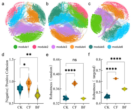 Co-occurrence networks and topological properties of fungal communities in the soil under CK (a), CF (b), and BF (c) treatments. Stability indicators for the soil microbial networks under different treatments, including the absolute ratio of negative to positive cohesion (d), robustness under random removal (e) and robustness under targeted removal (f). CK (no mulch film application), CF (addition of PE film fragments); BF (addition of PLA + PBAT film fragments). * p < 0.05, ** p < 0.01 and **** p < 0.0001, ns indicates no significant difference.